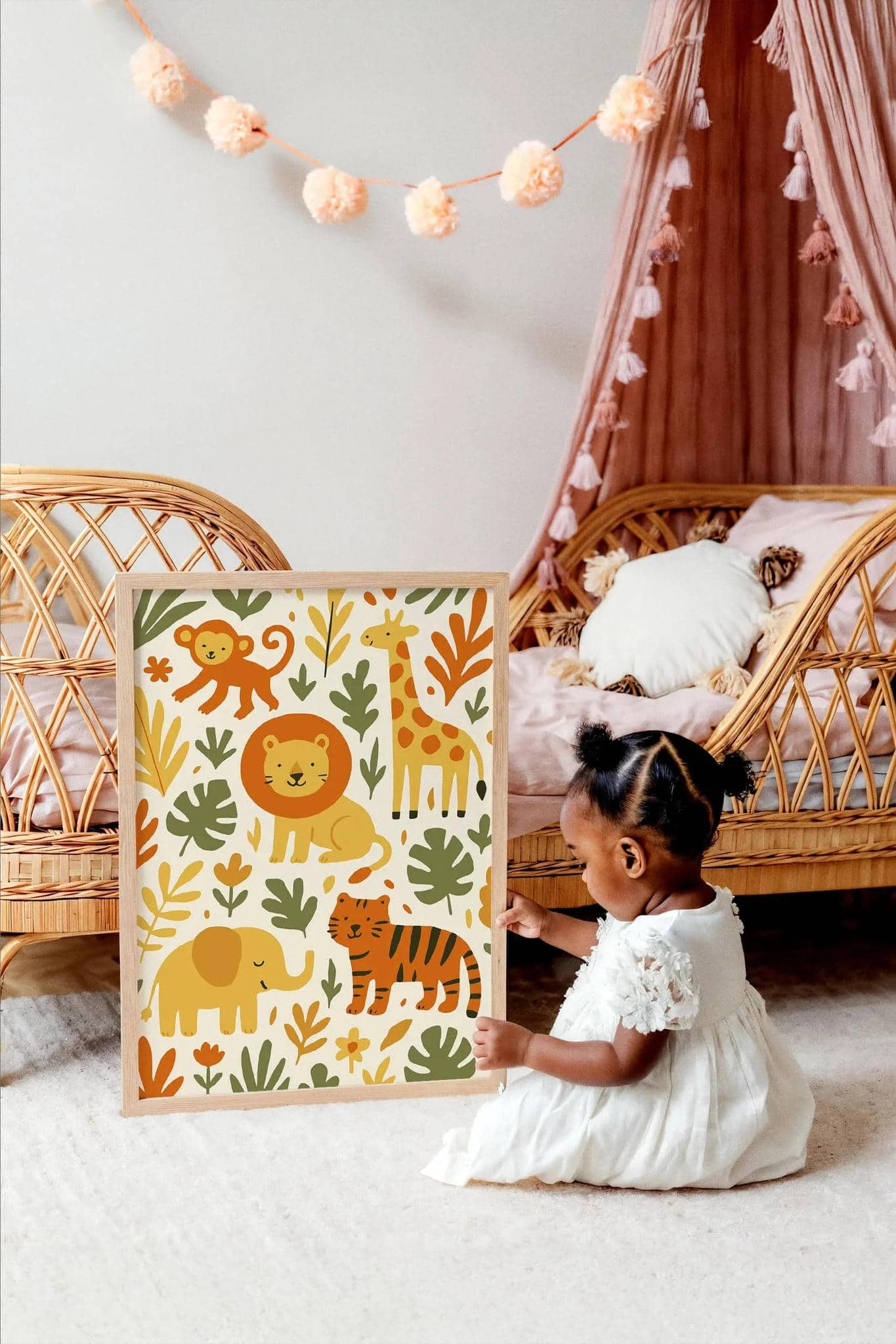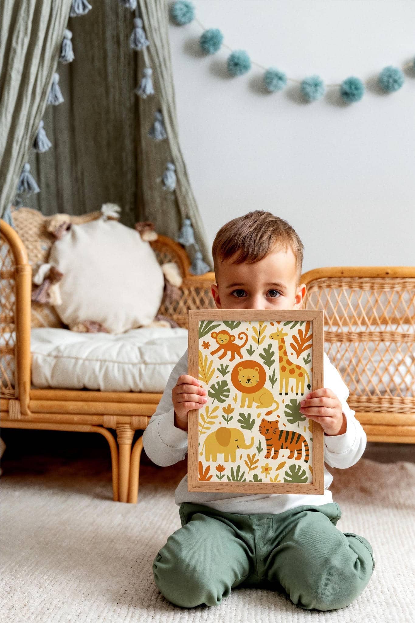 Add a wild touch to any room with this jungle print featuring a curious elephant, roaring lion, tall giraffe, and cheeky monkey – perfect for little adventurers!