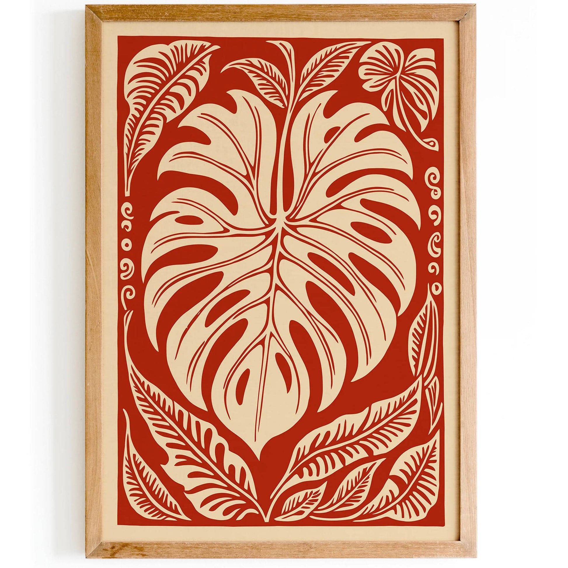 Red Monstera Leaf Poster, Linocut Style Wall Art